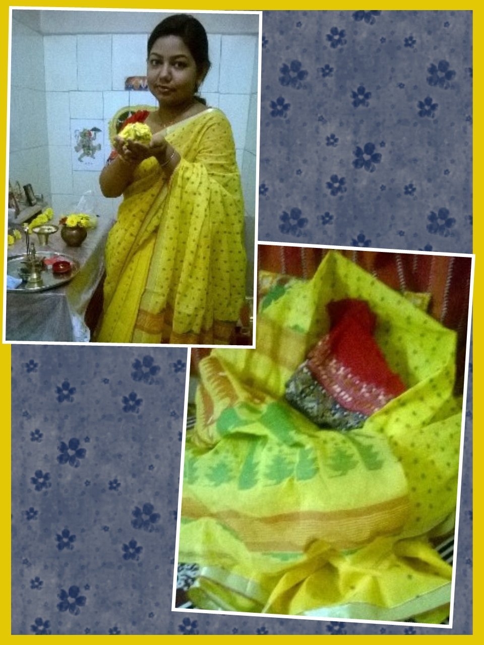 Day 16: Another Tant. A yellow hazaar buti. One of the many gifts of love from Mom, this one features quite high in my list of favourites. The blouse piece is a gift of love from another Ma, bought from Bolpur’s Khowai Haat